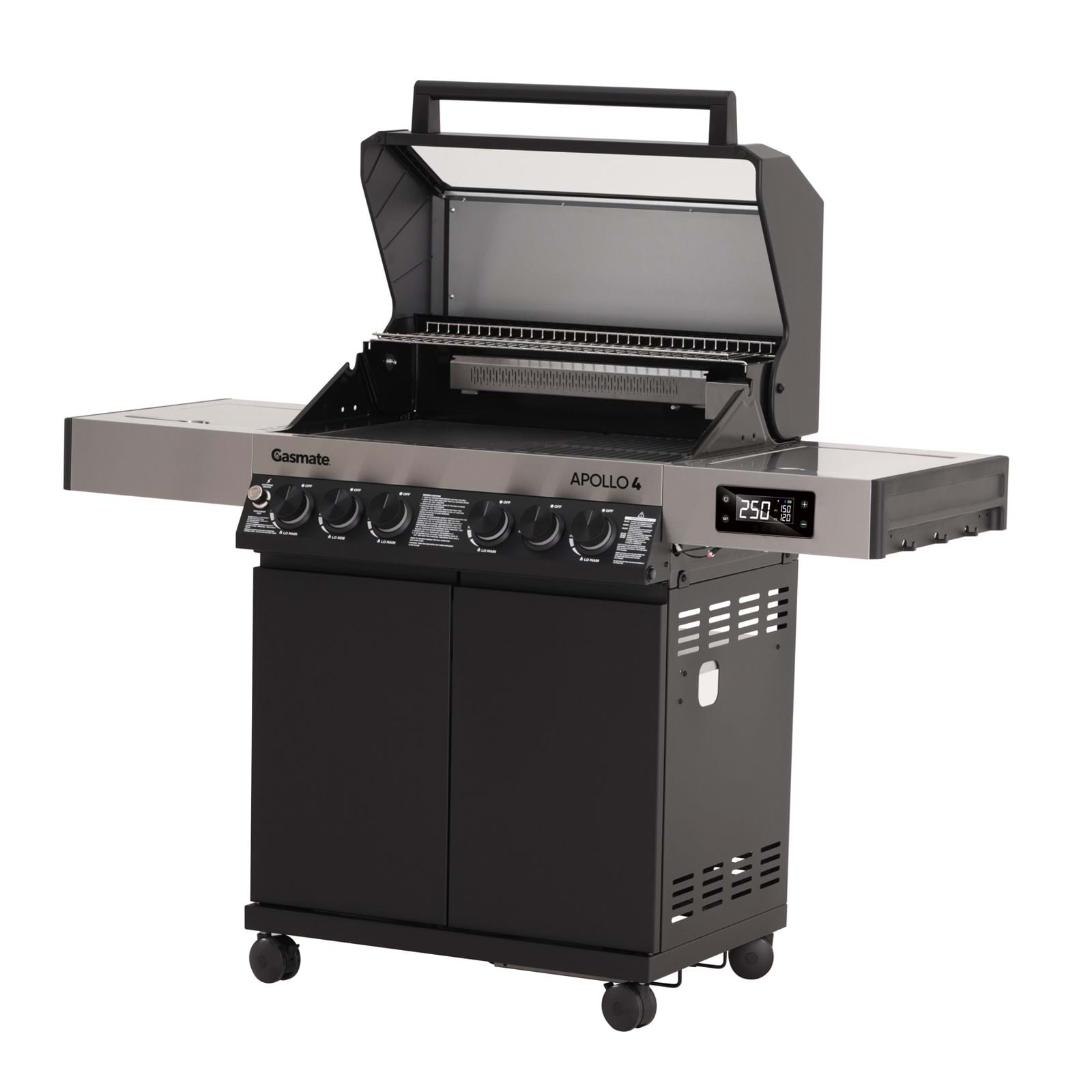The Gasmate Apollo 4 Burner BBQ delivers smart design and serious performance. Featuring a powder-coated body, and hood with a large glass viewing window, it’s as stylish as it is functional. Includes stainless steel fascia and side shelves, battery-powered digital control, two plug-in temperature probe all easily monitored via Bluetooth/WiFi smartphone app. A built-in ice or storage tub with lid and bamboo cutting board adds convenience, while LED-lit knobs indicate burner status at a glance. With 67.6MJ/h total output across four main burners, a rear burner with heat shield, and a side burner, this BBQ is built for precision and power.