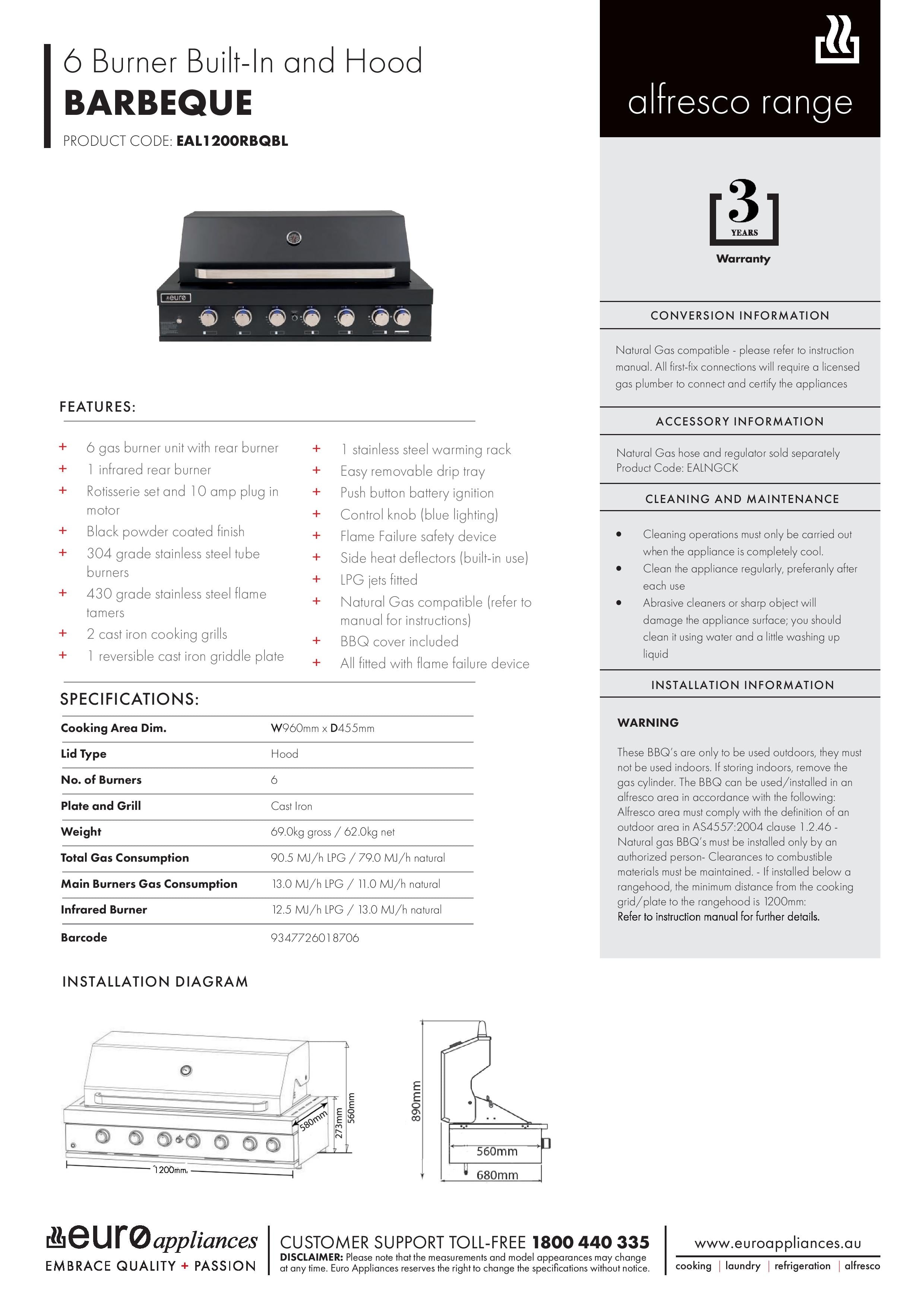 Warning: These BBQ’s are only to be used outdoors, they must not be used indoors. If storing indoors, remove the gas cylinder. The BBQ can be used/installed in an alfresco area in accordance with the following: Alfresco area must comply with the definition of an outdoor area in AS4557:2004 clause1.2.46 - Natural gas BBQ’s must be installed only by an authorized person-Clearances to combustible materials must be maintained. - If installed below a rangehood, the minimum distance from the cooking grid/plate to the rangehood is 1200mm: