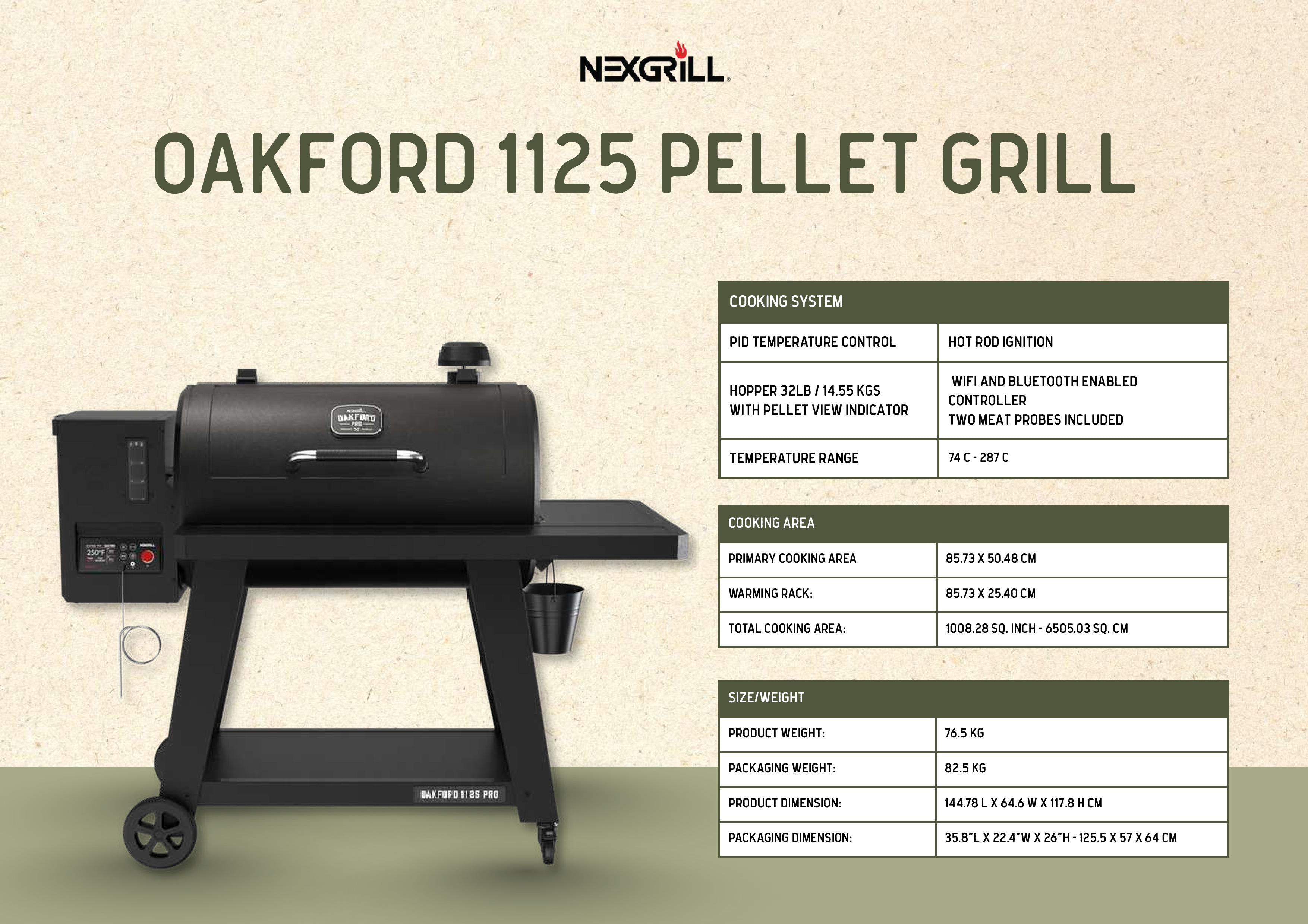 The Nexgrill Oakford 1125 Pro Pellet Grill is built for big cooks and serious entertaining, with a large cooking surface and powerful performance for long, low and slow smoking or high-heat grilling.